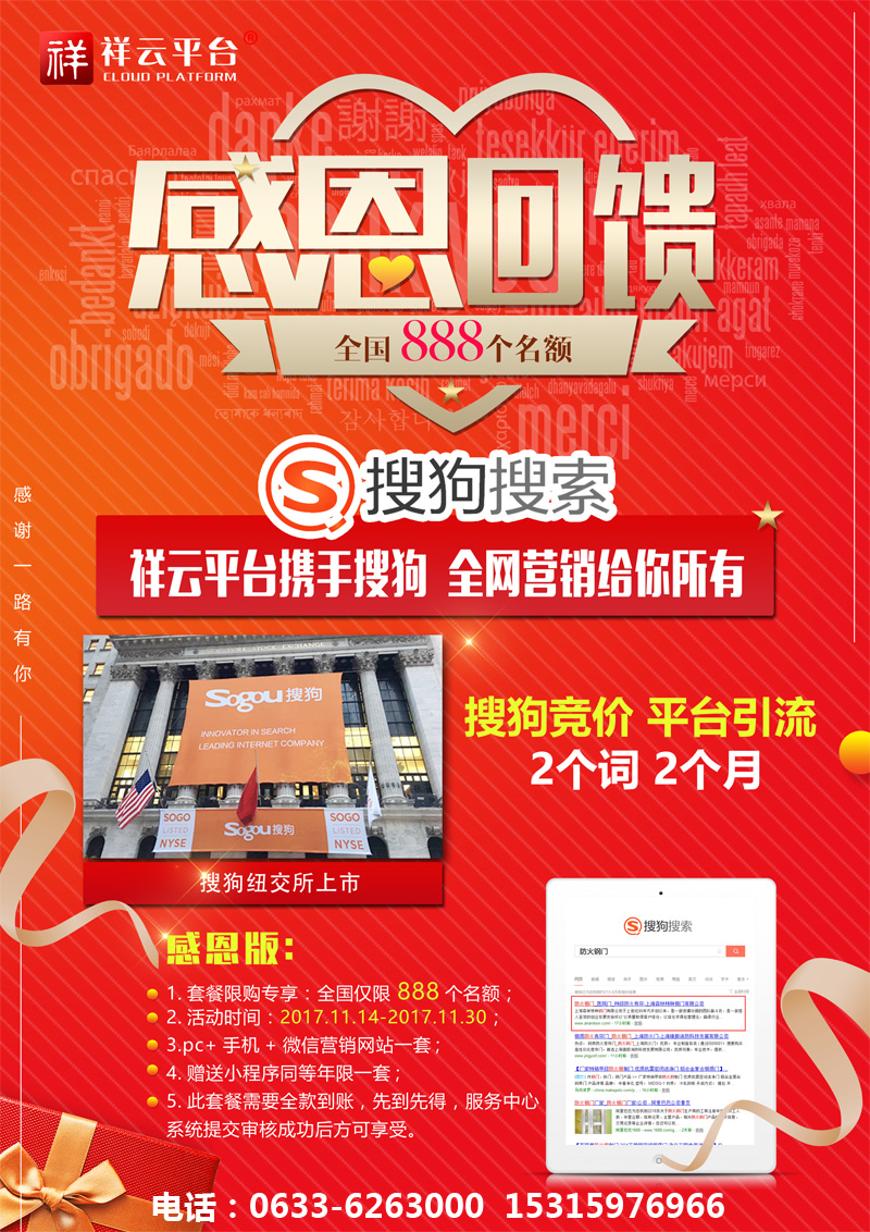 2017年11月9日,搜狗在紐交所上市,成為國內第二大搜索引擎,祥云聯合搜狗,推出2017感恩鉅惠活動:凡簽約祥云營銷型網站,即送搜狗競價關鍵詞,兩個詞,兩個月!名額有限,先到先得!電話:0633-6263000 15315976966
